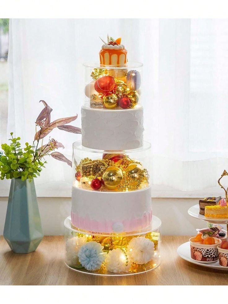 - It is a fillable cake stand, allowing for decoration with items like flowers, balloons, or confetti inside.